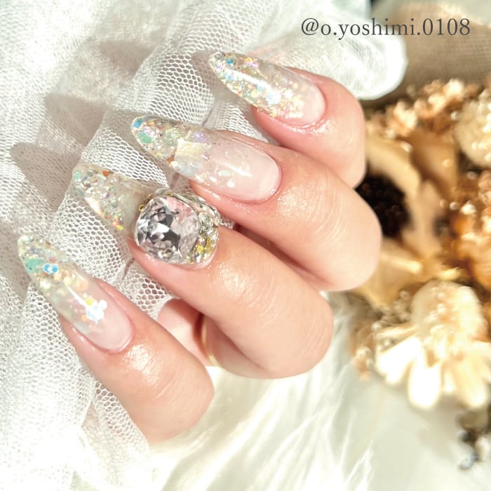 Flower series3:上品に輝くシルバー・シャンパングリッターと押し花がバランスよくミックスされたアクリルパウダー。