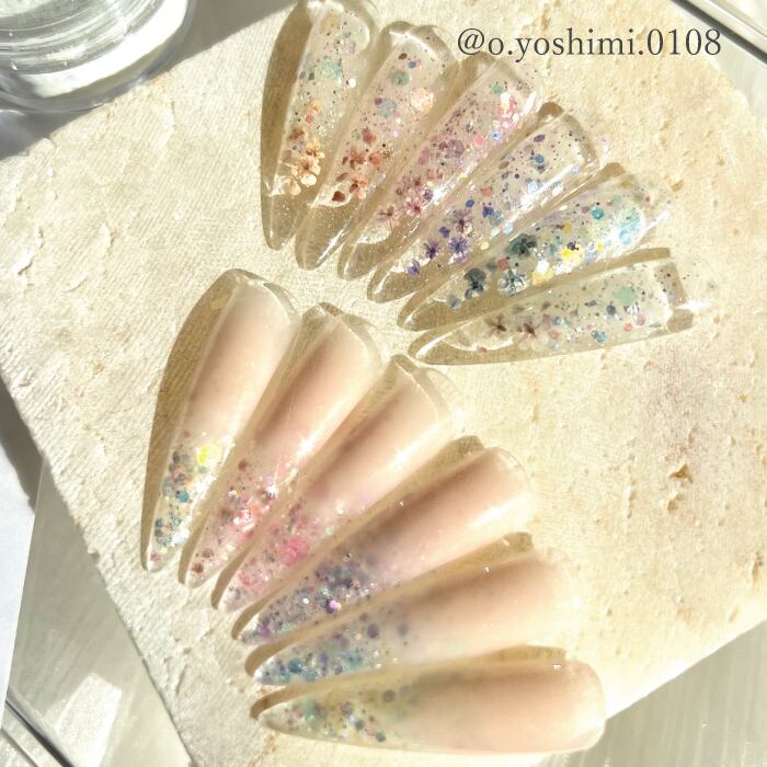 Flower series2:上品にほんのり輝くオーロラフレークと押し花がバランスよくミックスされたアクリルパウダー。