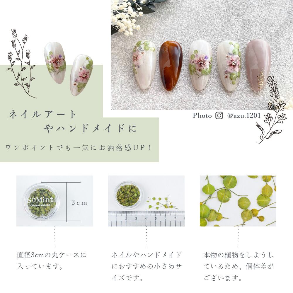 エスミント シエル ドライフラワー リーフ 葉類 ボタニカル 押し花 花 プリザーブドフラワー ネイル ネイルアート ネイル用品 ネイル用押し花 ネイルパーツ アクセサリー アクセサリーパーツ パーツ ハンドメイド ハンドメイド材料 ピアス レジン ハーバリウム かすみ草 レースフラワー ガーベラ デコ デコパーツ botanical nail nailart