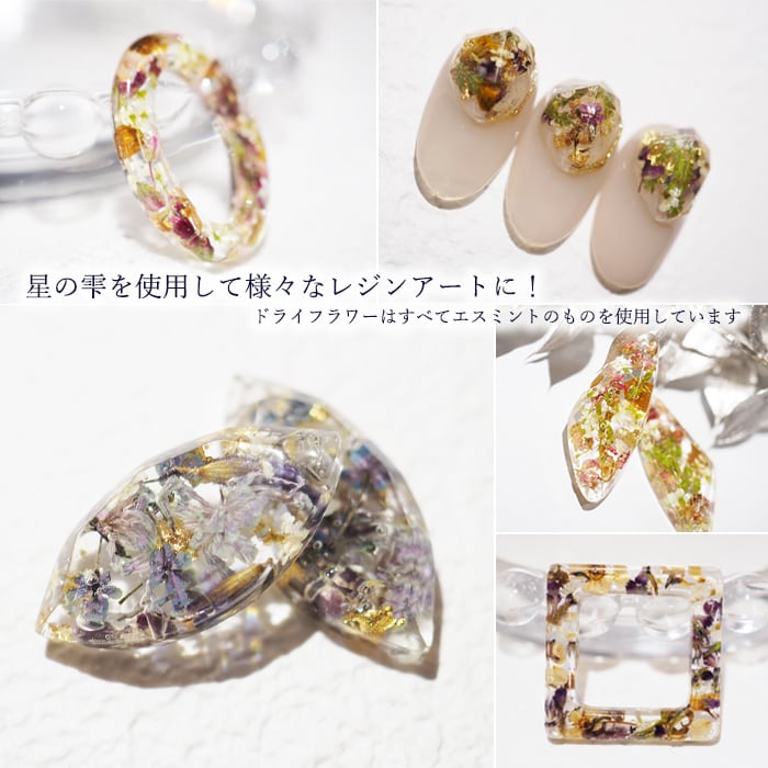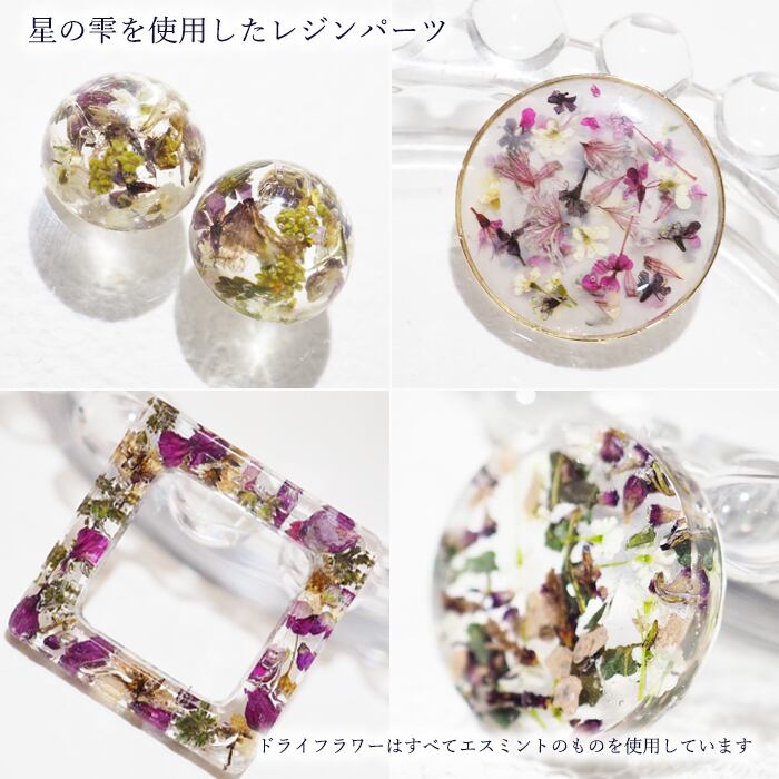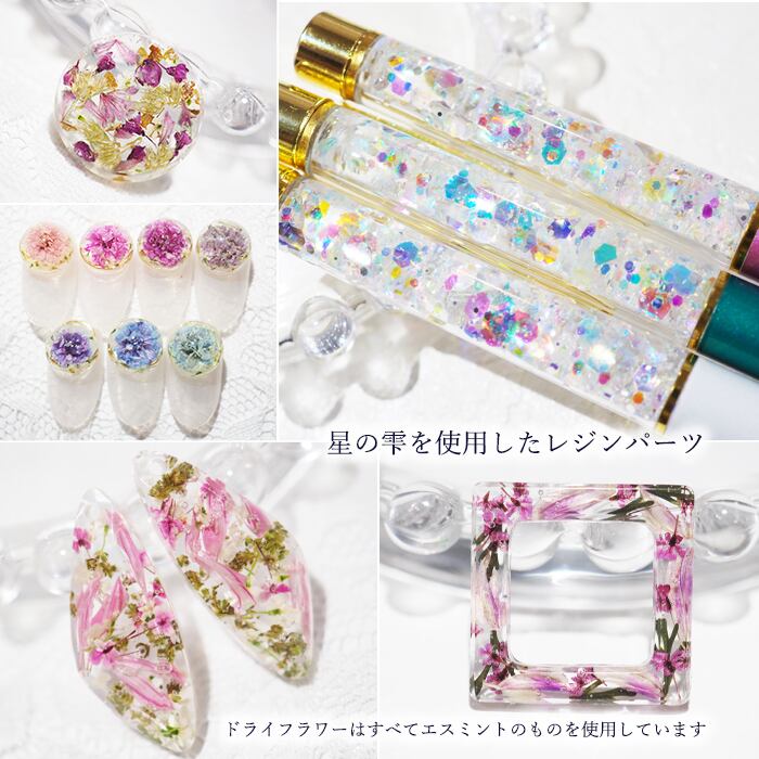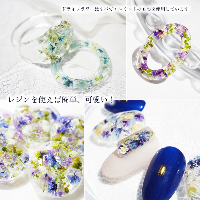 商品画像で使用しているドライフラワーやドライリーフ・オーロラホログラム等はすべてエスミントの商品を使用しています。