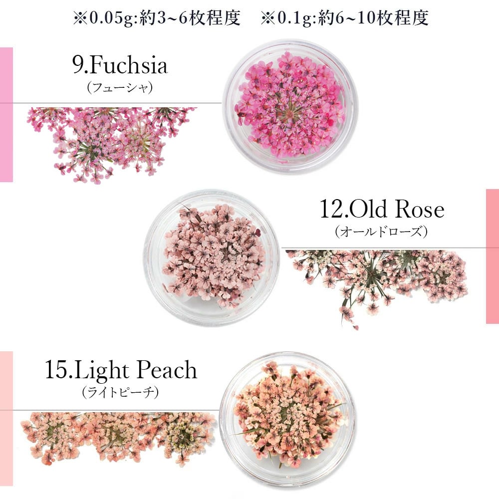 上品なネイルデザインやアクセサリーに仕上がるようイメージをして販売セットをご用意していますので、お花の種類によっては、花びらの大きさが揃っていないもの、花びらがかけたお花なども含まれます。