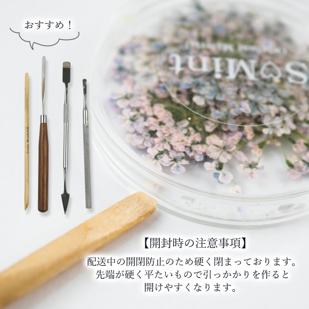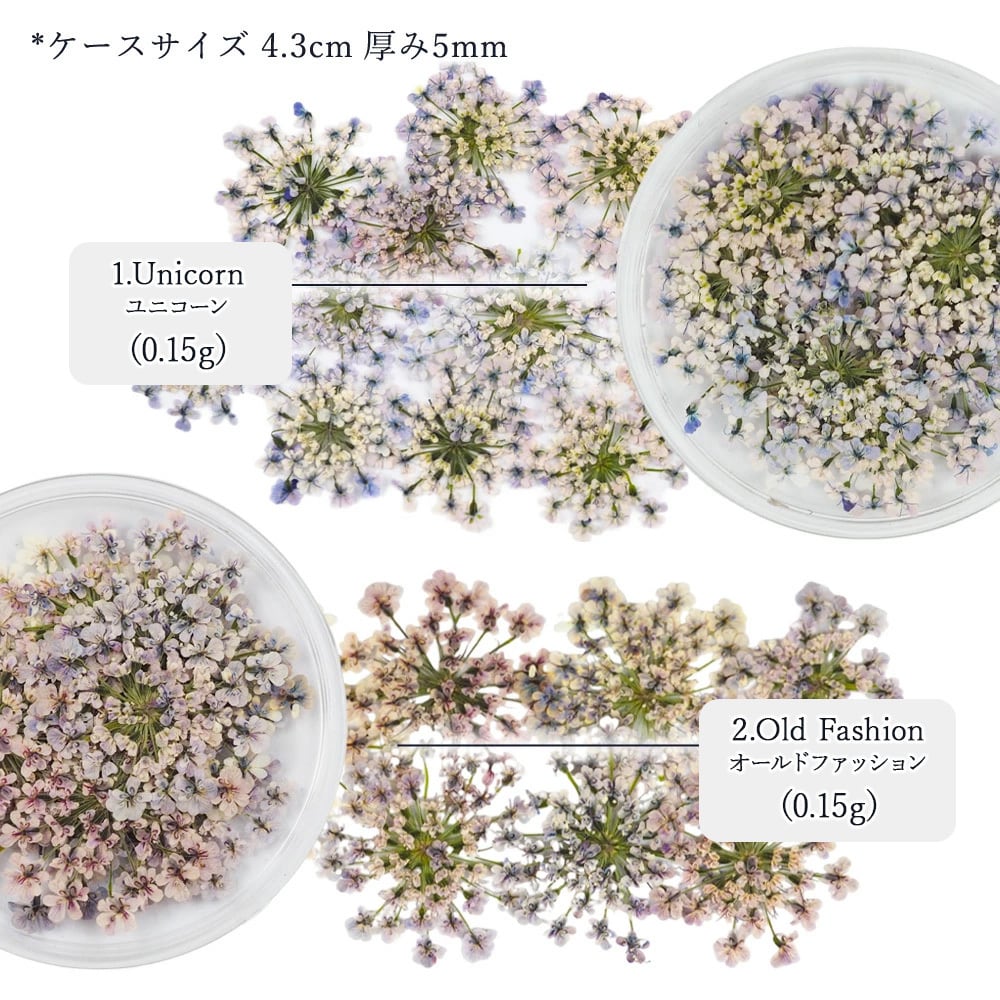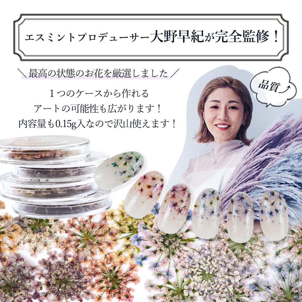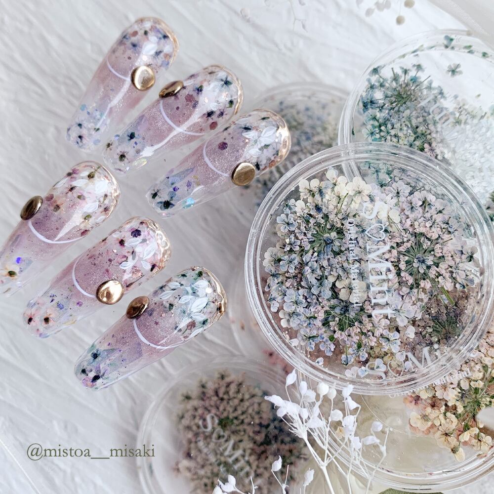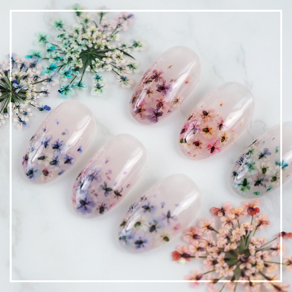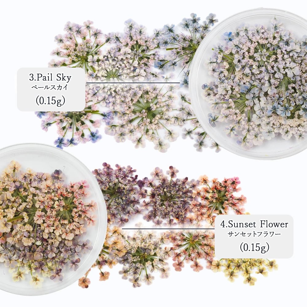 他にはない絶妙なカラーラインナップの6色!生産数が多く作れないので、売り切れになってしまうことも!押し花はとっても薄いため、ネイルアートやハンドメイド、アクセサリー作りなど様々なデザインつくりにお使いいただけます。
