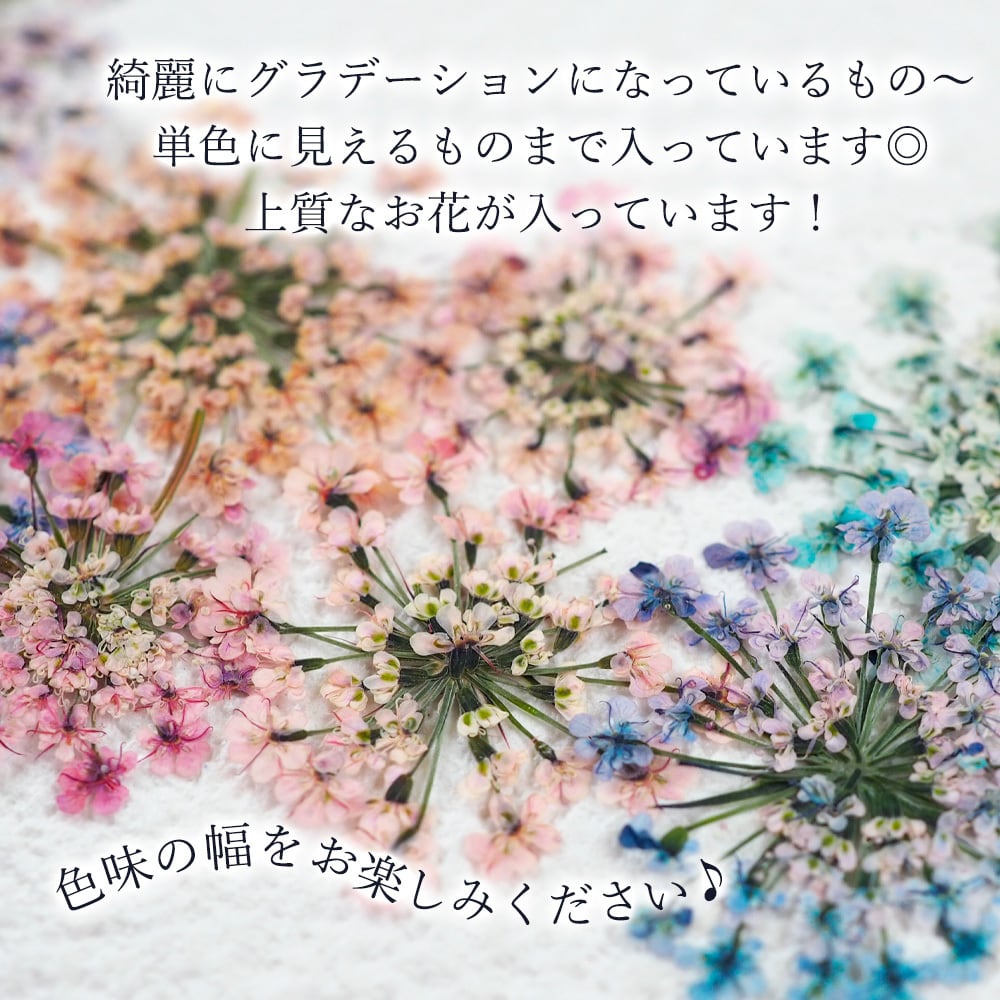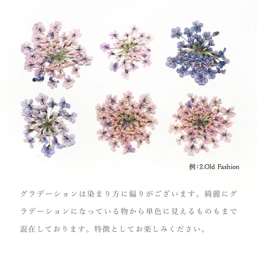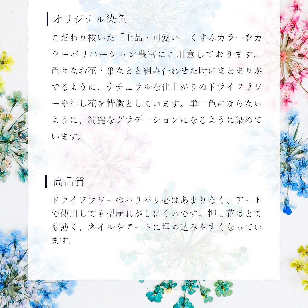 ・お花は生のお花を染色し、ドライや押し花に加工していますので、画像と実物で色やサイズなど多少異なる場合がございます。