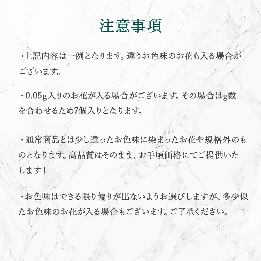 その製造過程で、通常商品とわずかに違ったお色に仕上がったものや、少しだけ形が崩れているもの、お花が小さいものなど、通常商品にならなかったお花があります。